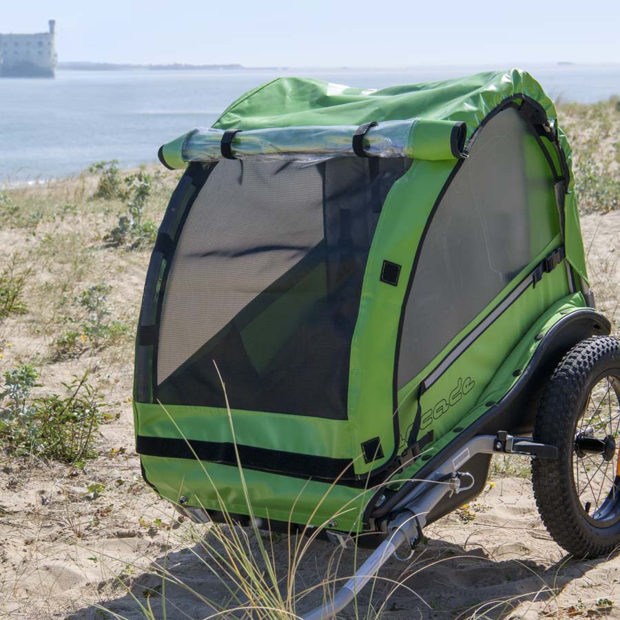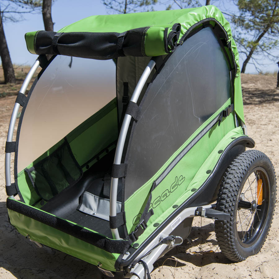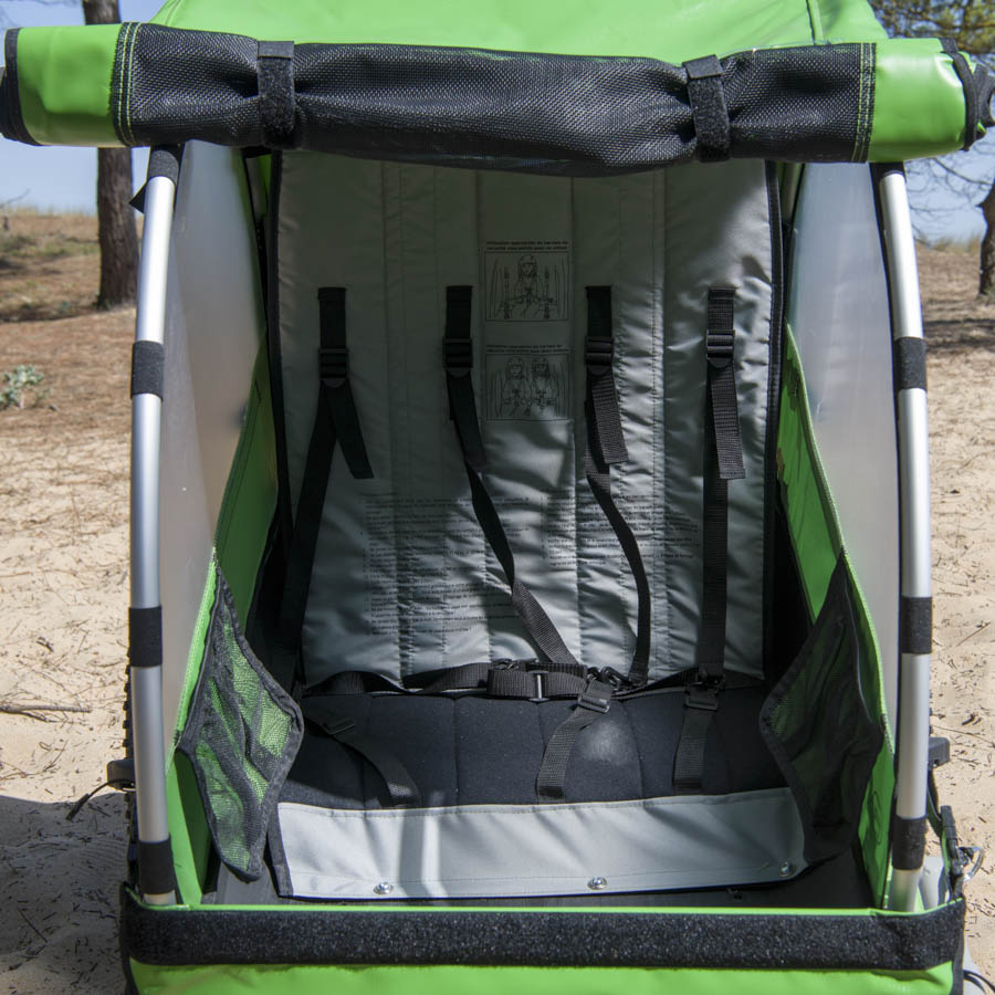 Remorque 2 enfants avec un maxi de 48 kg, homologués pour les plus grands, double ceinture de sécurité